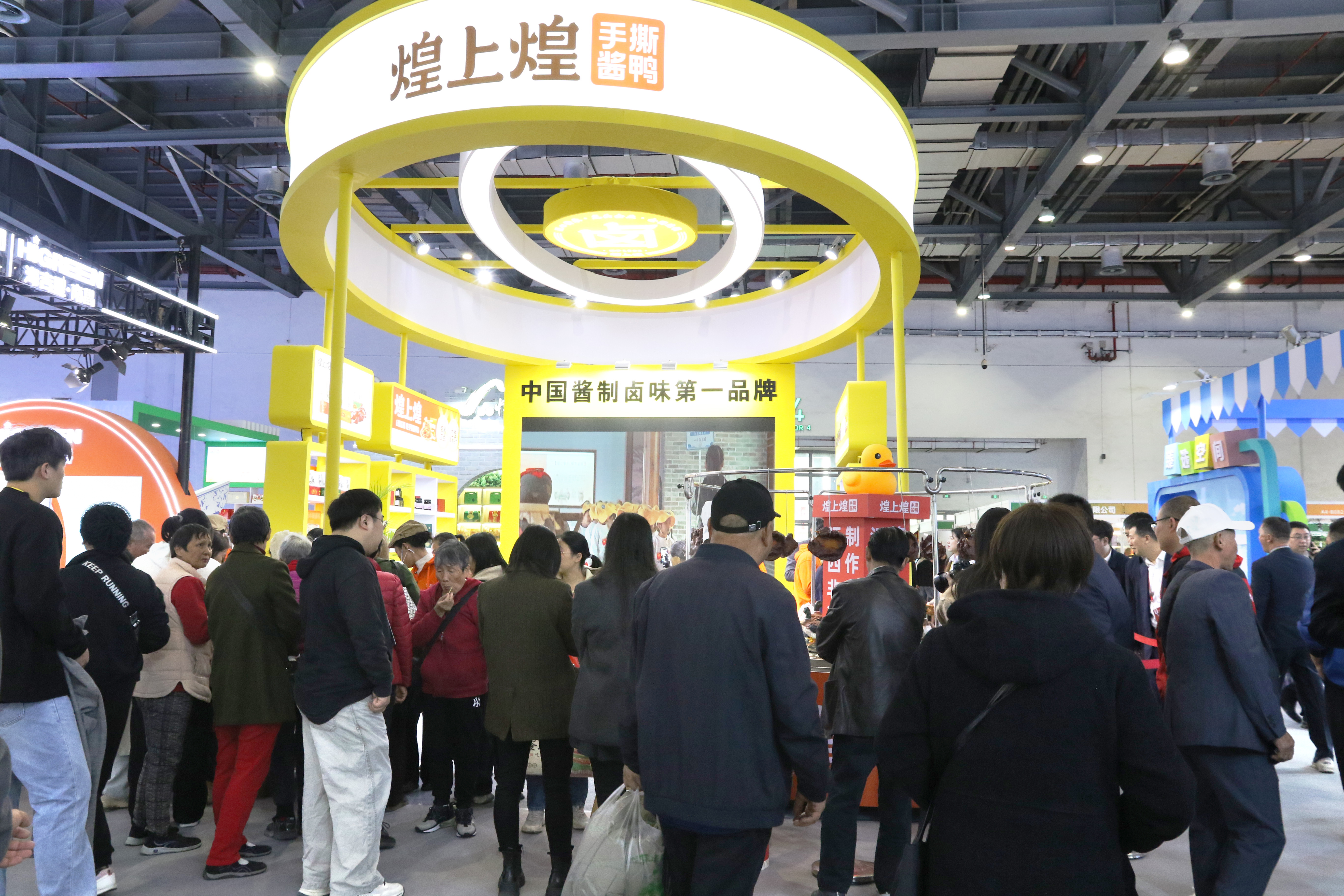 會(huì)上,煌上煌搭建起品牌專(zhuān)屬展區(qū),被列為“江西美食名片”的手撕醬鴨、樂(lè)鮮裝鮮貨系列、包裝產(chǎn)品、真真老老禮盒、新西蘭新溪島蜂蜜等等,品類(lèi)豐富、琳瑯滿目,強(qiáng)勢(shì)展出了煌上煌品牌的多樣性,。直徑2.8米的大鹵鍋架設(shè)在展廳,鍋內(nèi)三十余味香料與陳年老鹵翻滾交融,現(xiàn)鹵的醬鴨泛著琥珀色光澤,空氣中彌漫著濃郁的醬香,讓人垂涎欲滴。醬鹵師傅現(xiàn)撕、現(xiàn)拌,現(xiàn)場(chǎng)免費(fèi)品嘗手撕醬鴨,吸引了眾多展商上前品嘗,大家贊不絕口。同時(shí),展區(qū)也招攬了許多意向合作商前來(lái)洽談與合作。