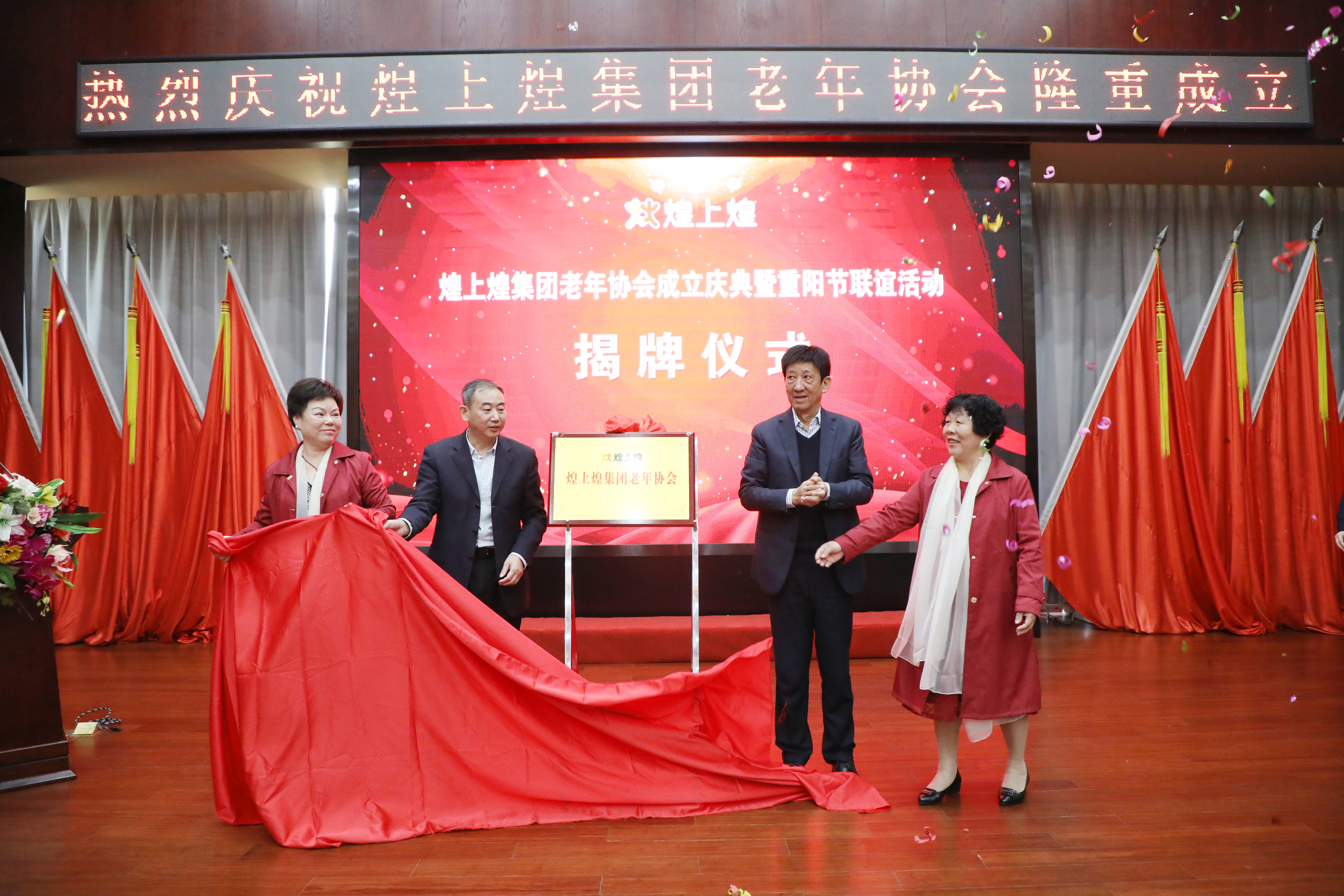 在熱烈的掌聲中,小藍經開區黨工委副書記徐峰,煌上煌集團主席徐桂芬、總裁褚建庚,協會第一屆理事會會長彭四新共同為“煌上煌集團老年協會”揭牌。